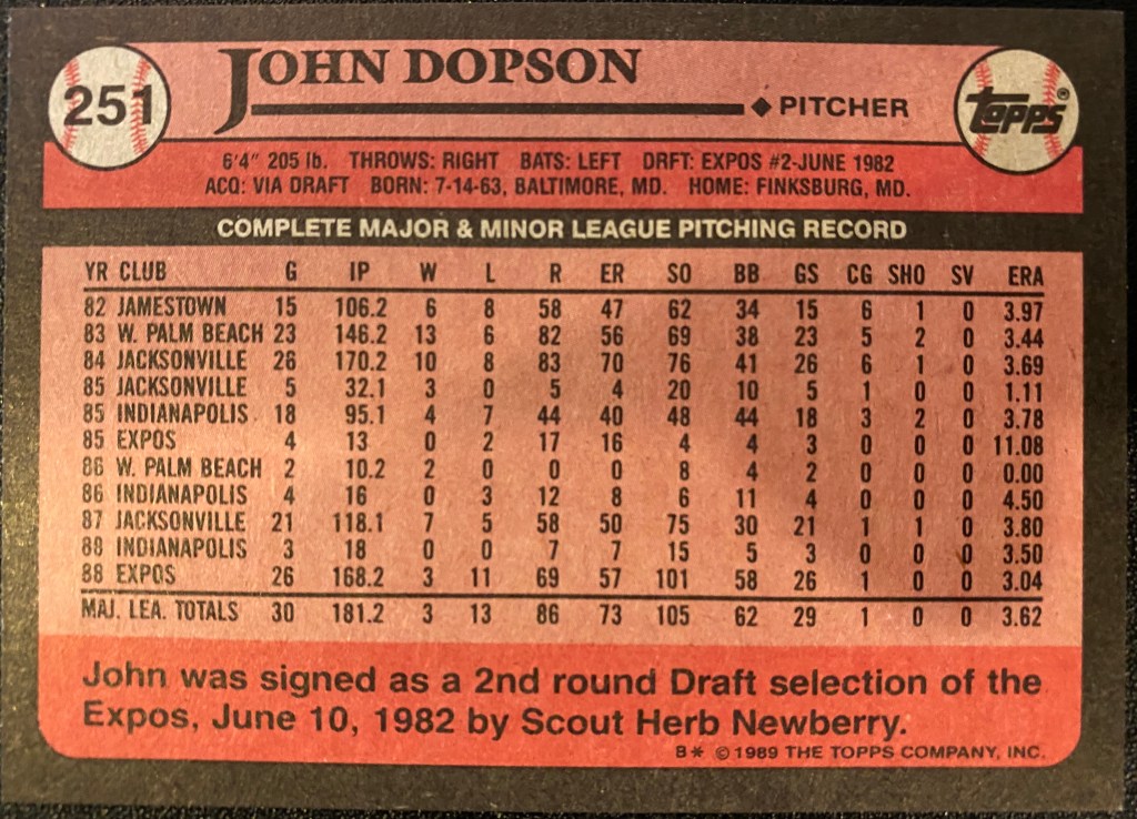 1989. John Dopson was born in Baltimore, Maryland. A fun fact about his pitching career is that he is the last pitcher to balk 4 times in one game, a feat he achieved on June 13, 1989. A balk is the pitcher not coming to a complete stop on the mound before pitching. To be fair to John, baseball umpires had decided to crack down on that rule this year, unfortunately helping him get his name in the record books.