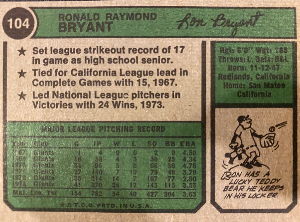 1974. This is Ron Bryant, who pitched in the MLB from 1967-1975. He primarily played for San Francisco during his career, in his home state of California.